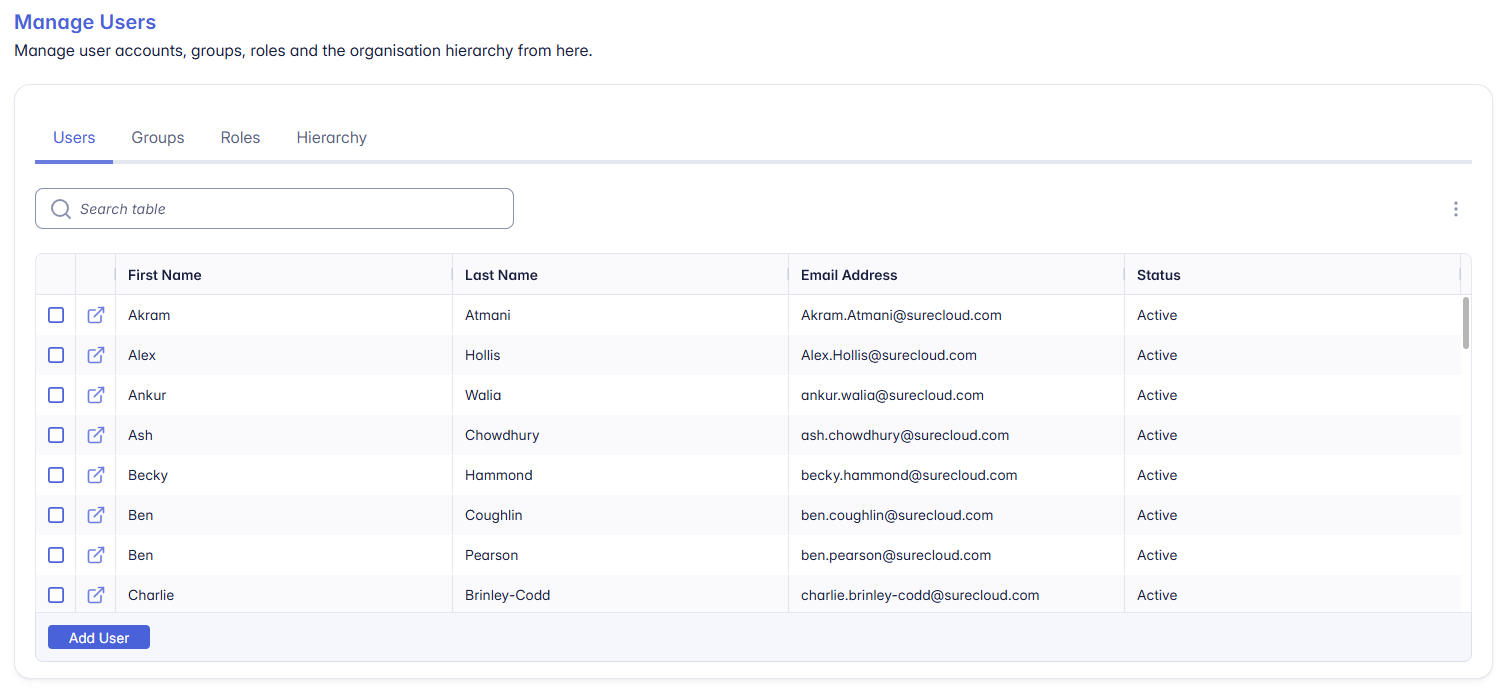 User accounts can be created and managed through the Manage Users screen. To update roles in the system, navigate to the Manage Users screen.