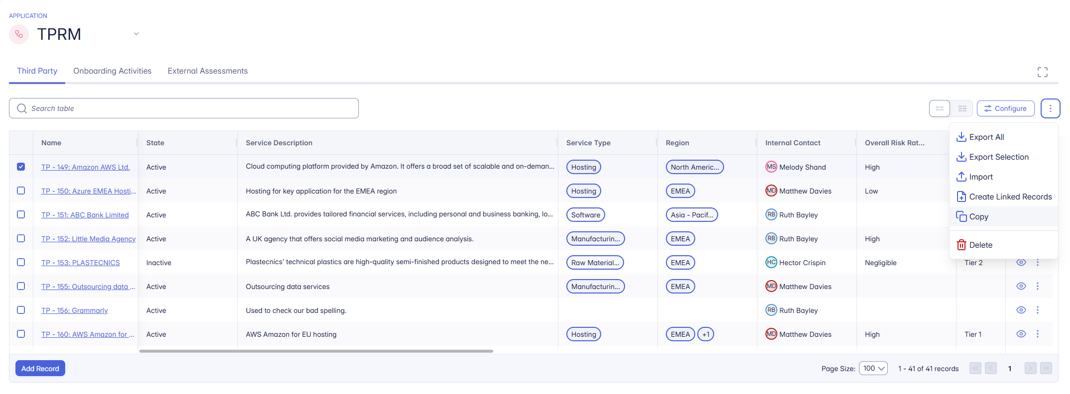 - Open the three-dot action menu on the right side of the table and choose Copy from the dropdown.