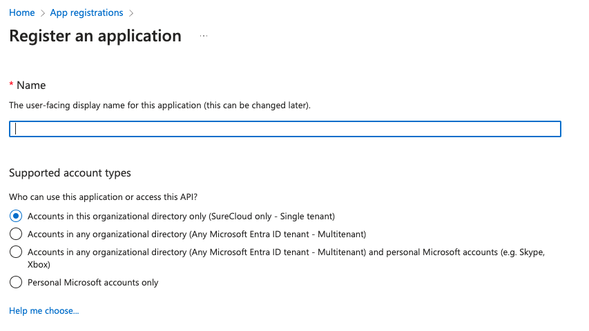 - Provide a name for the application and select Accounts in this organizational directory only (your tenant name).