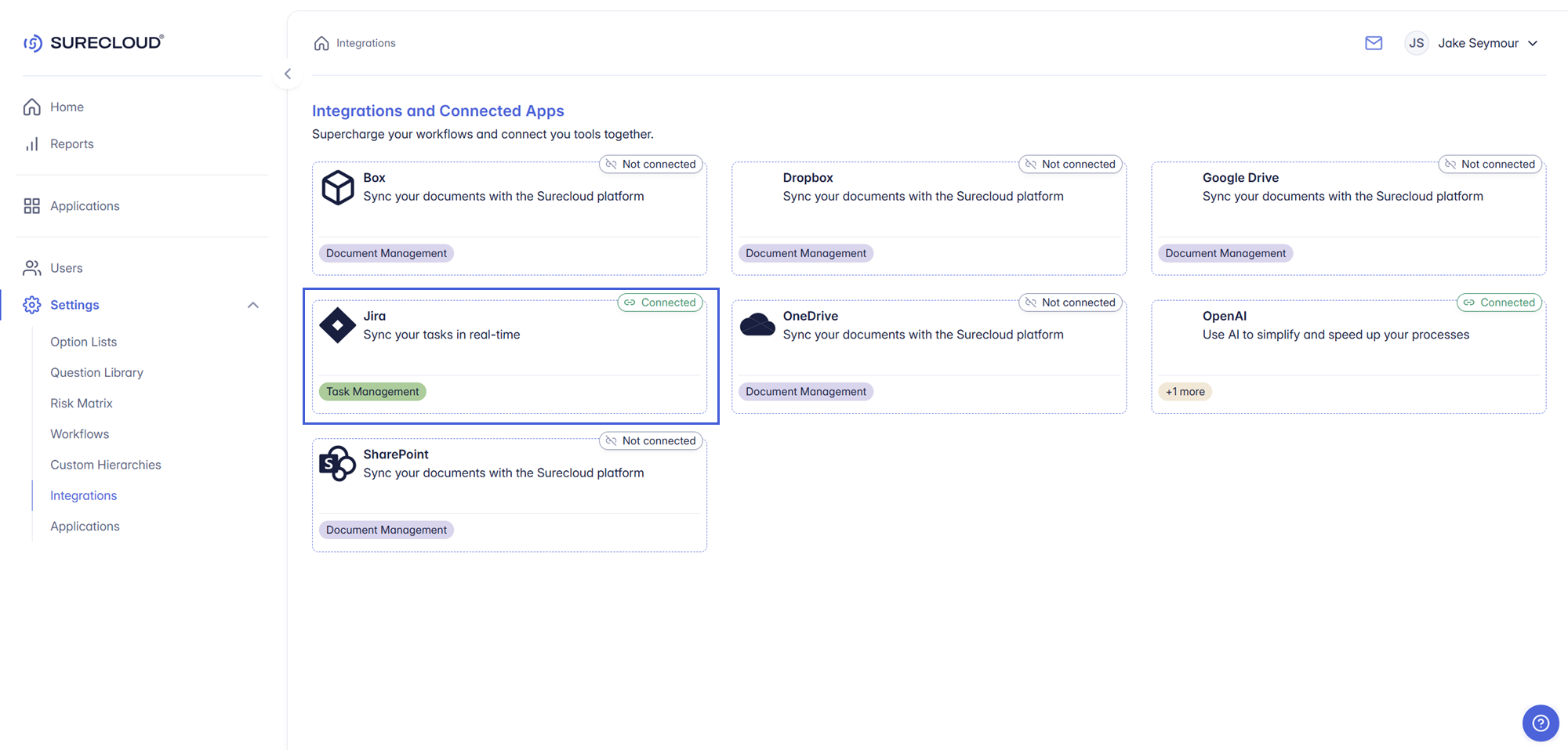 To get started, you'll need to link your Jira account to the SureCloud platform.