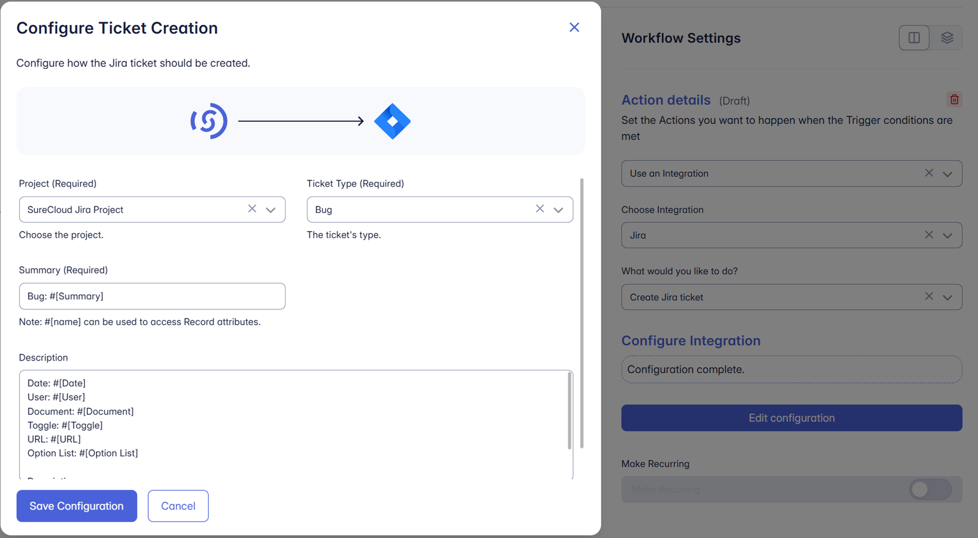 This is useful for keeping Jira in sync with actions taken within the SureCloud platform.