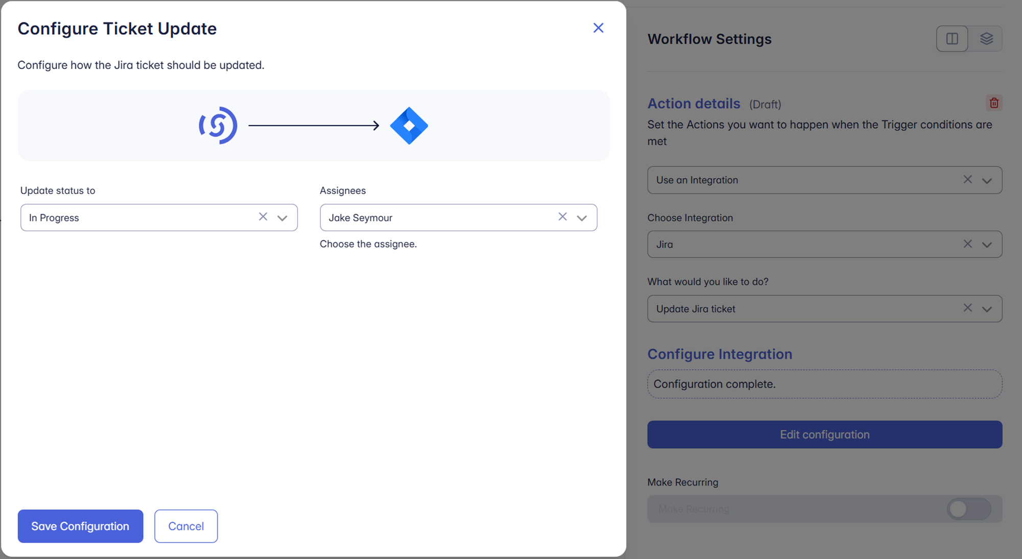 - Dependency on Ticket Creation: You must set up the Create Jira Ticket action before adding an Update Jira Ticket action. This ensures that there's a ticket available to update.