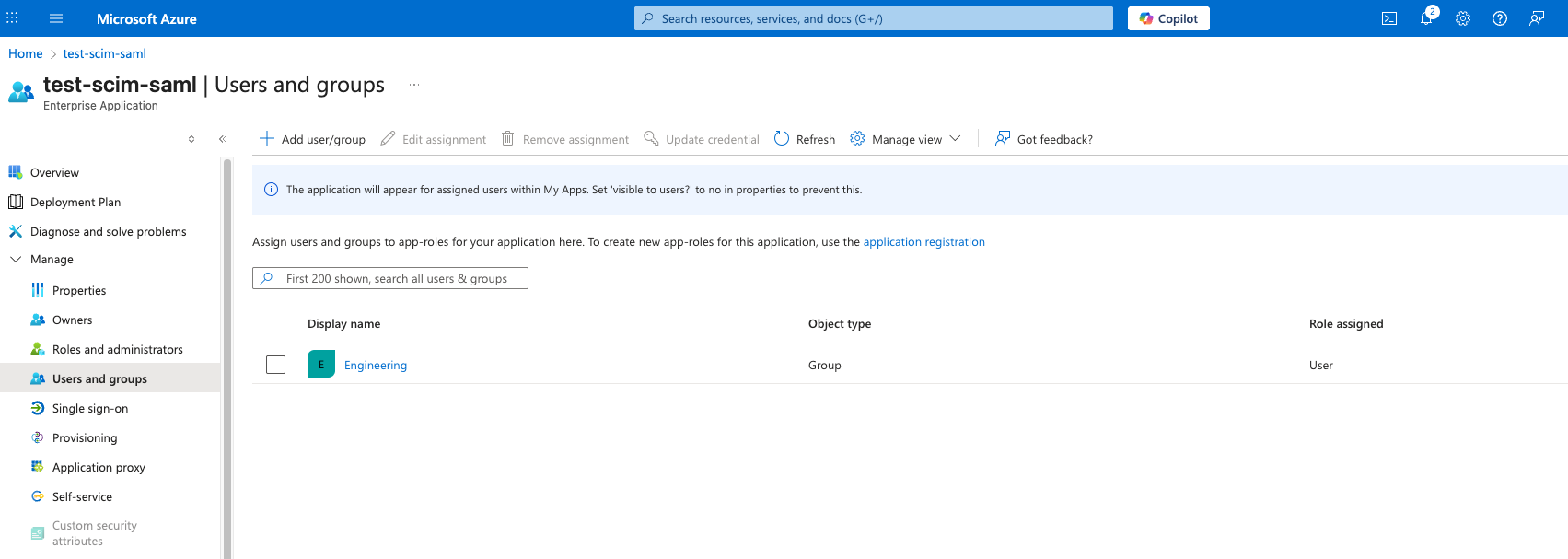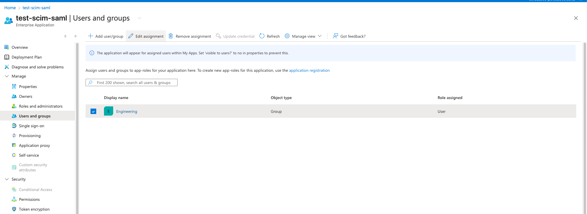 Navigate to Users and groups section of the SCIM application and click on application registration.