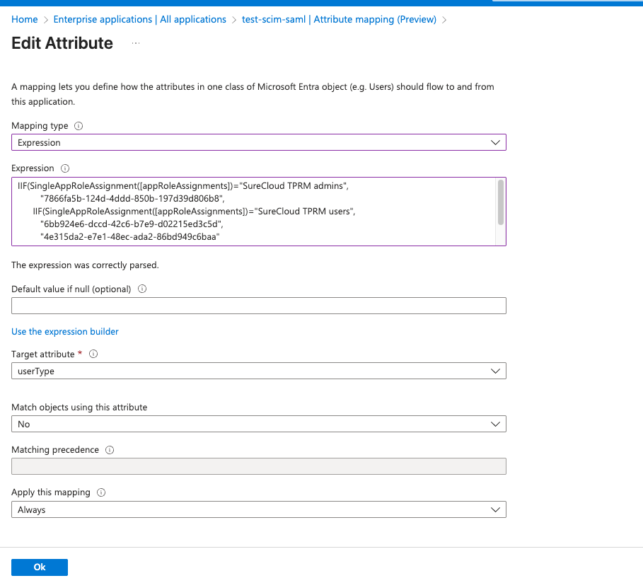 For example, below is an expression that will map a user to SureCloud groups based on Entra membership:IIF(SingleAppRoleAssignment([appRoleAssignments])="SureCloud Service Accounts","IGNORE",IIF(SingleAppRoleAssignment([appRoleAssignments])="SureCloud TPRM admins","7866fa5b-124d-4ddd-850b-197d39d806b8",IIF(SingleAppRoleAssignment([appRoleAssignments])="SureCloud TPRM users","6bb924e6-dccd-42c6-b7e9-d02215ed3c5d","4e315da2-e7e1-48ec-ada2-86bd949c6baa")))Note: SureCloud TPRM admins in this example is the name of an App Role that is assigned to the group of the same name in Entra. The UUID's are the ids of desired SureCloud groups that these users should be in.
