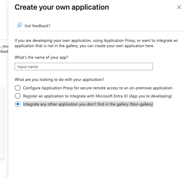 Click Create your own application. Call it something appropriate and select the radio box Integrate any other application you don't find in the gallery (Non-gallery).