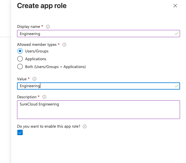 Create an app role for each of your app groups that you want to sync to 1 or more SureCloud groups. Note the name as it will be the key we filter for the next section.