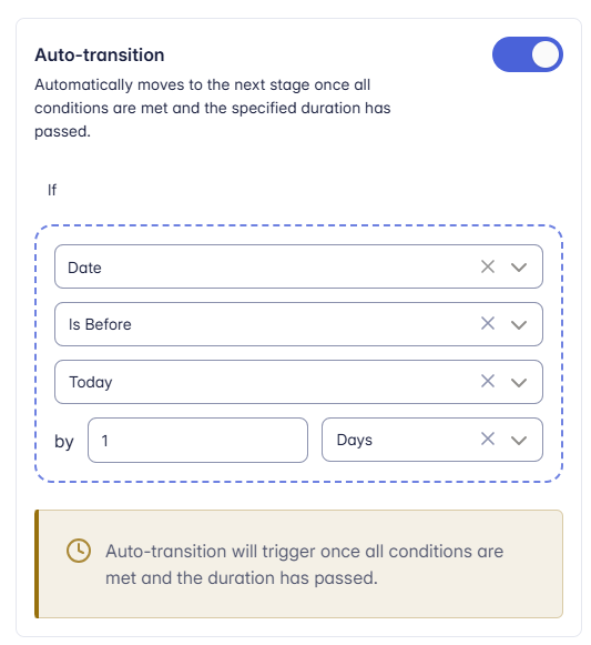 • Toggle this on to activate auto-transition behaviour and select the date conditions, i.e. Date Is Before Today by 1 Day.