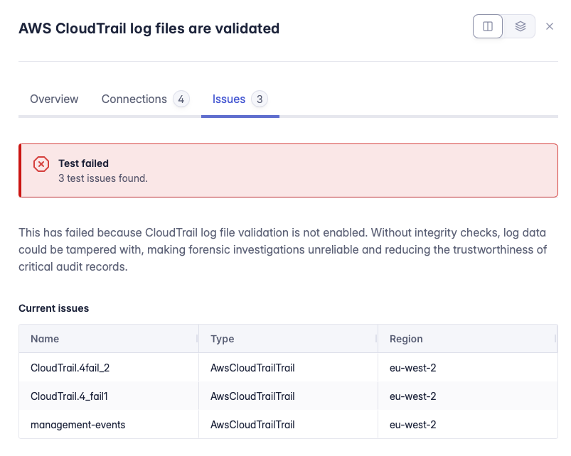 Only accessible by users with the correct permissions, this tab displays any control test failures. This might include: