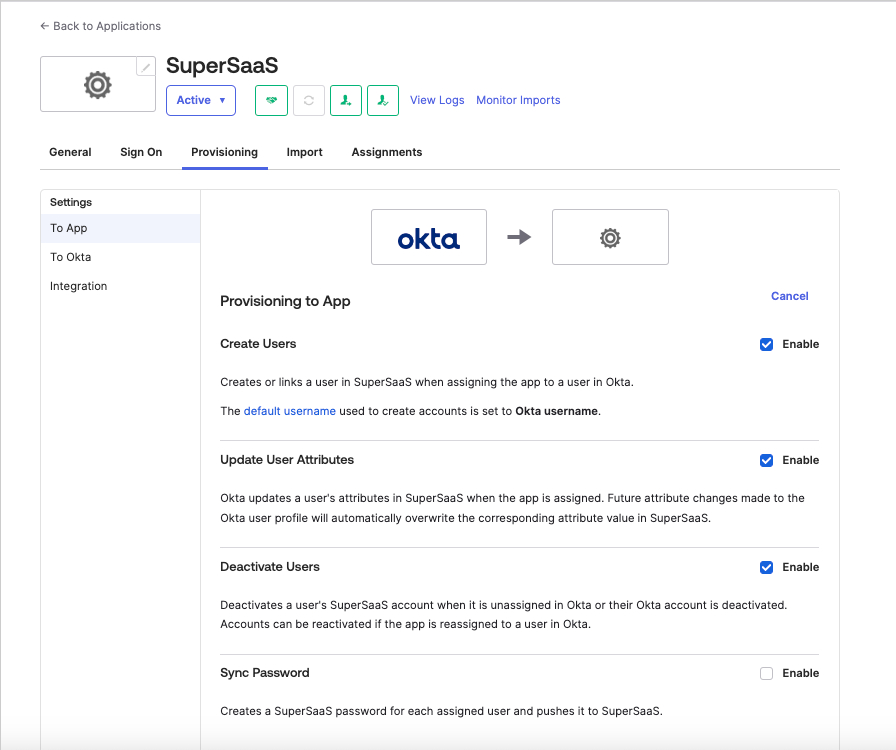 - Browse to Provisioning > Settings > To App and choose Edit, then enable the Create Users, Update User Attributes, and Deactivate users operations. Select Save.